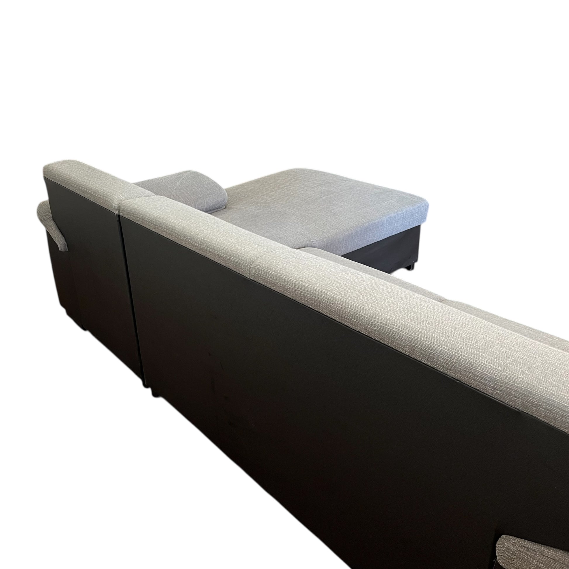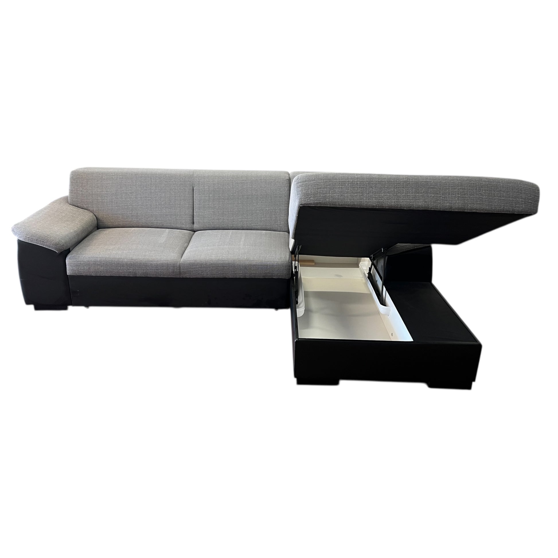 Gebrauchtes Ecksofa in Grau mit schwarzer Lederoptik. Das Sofa verfügt über Stauraum und hat eine Bettfunktion.