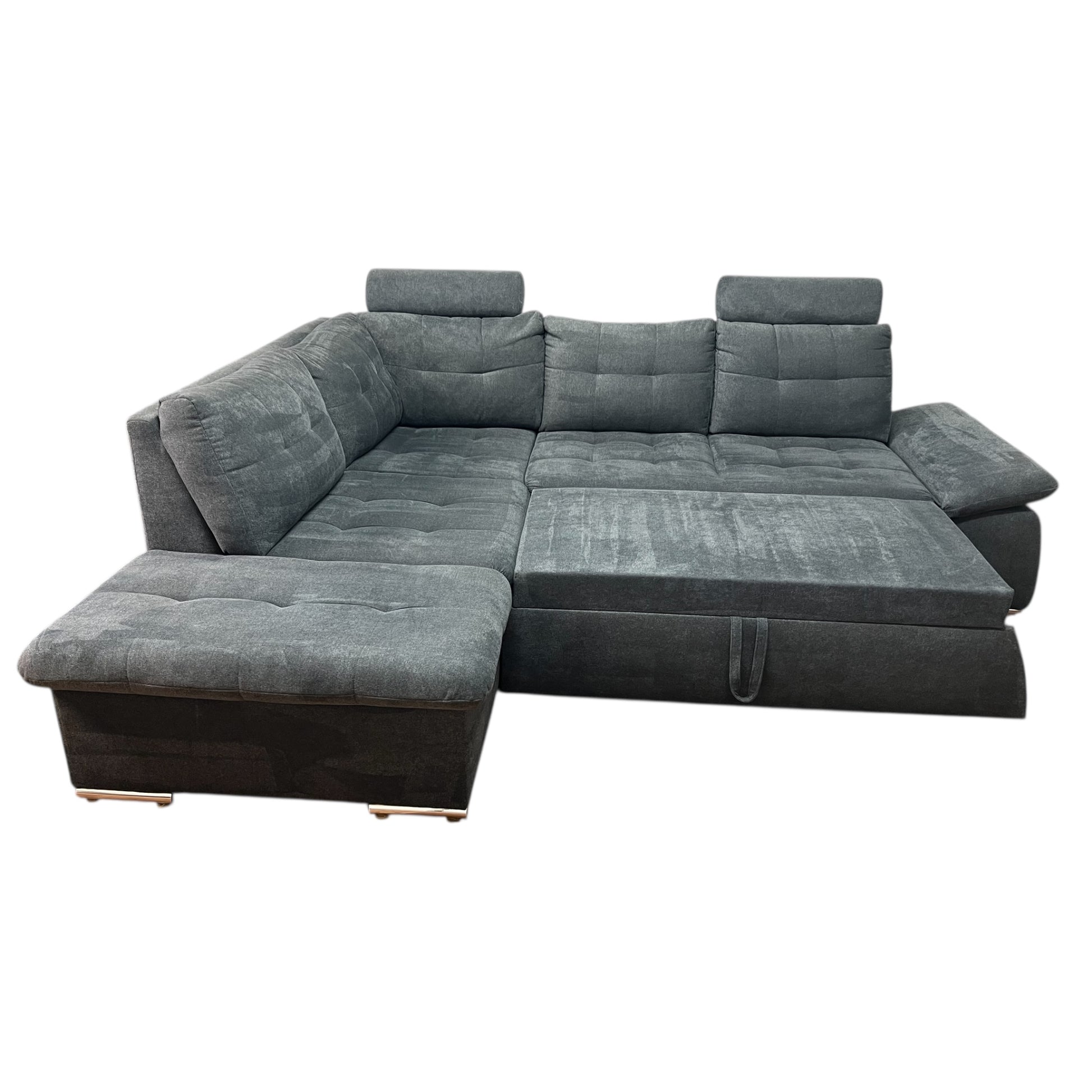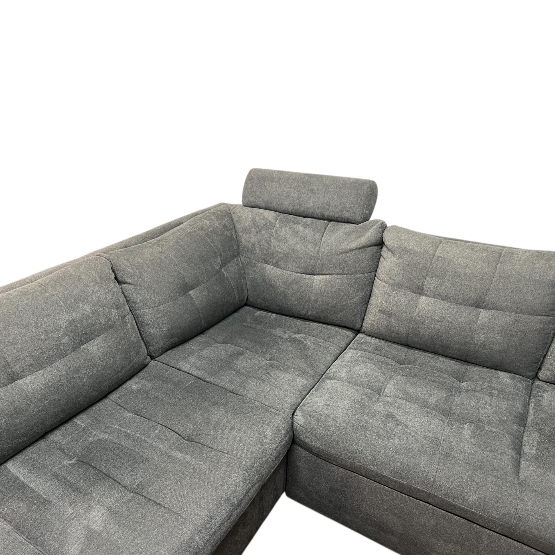 Gebrauchtes Ecksofa in Grau. Das Sofa verfügt über Stauraum und hat eine Bettfunktion.